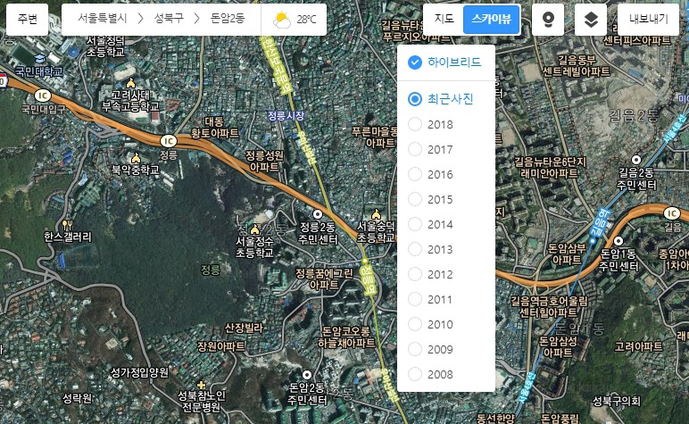 우측 상단에 지도라고 표시된곳 옆에 있는 스카이뷰 메뉴 버튼을 클릭하시면 활용할 수 있다고 합니다. 게다가 내보내기를 누르면 해당 지도에 해단 데이터를 url로라던지 핸드폰으로도 보낼 수 있습니다.